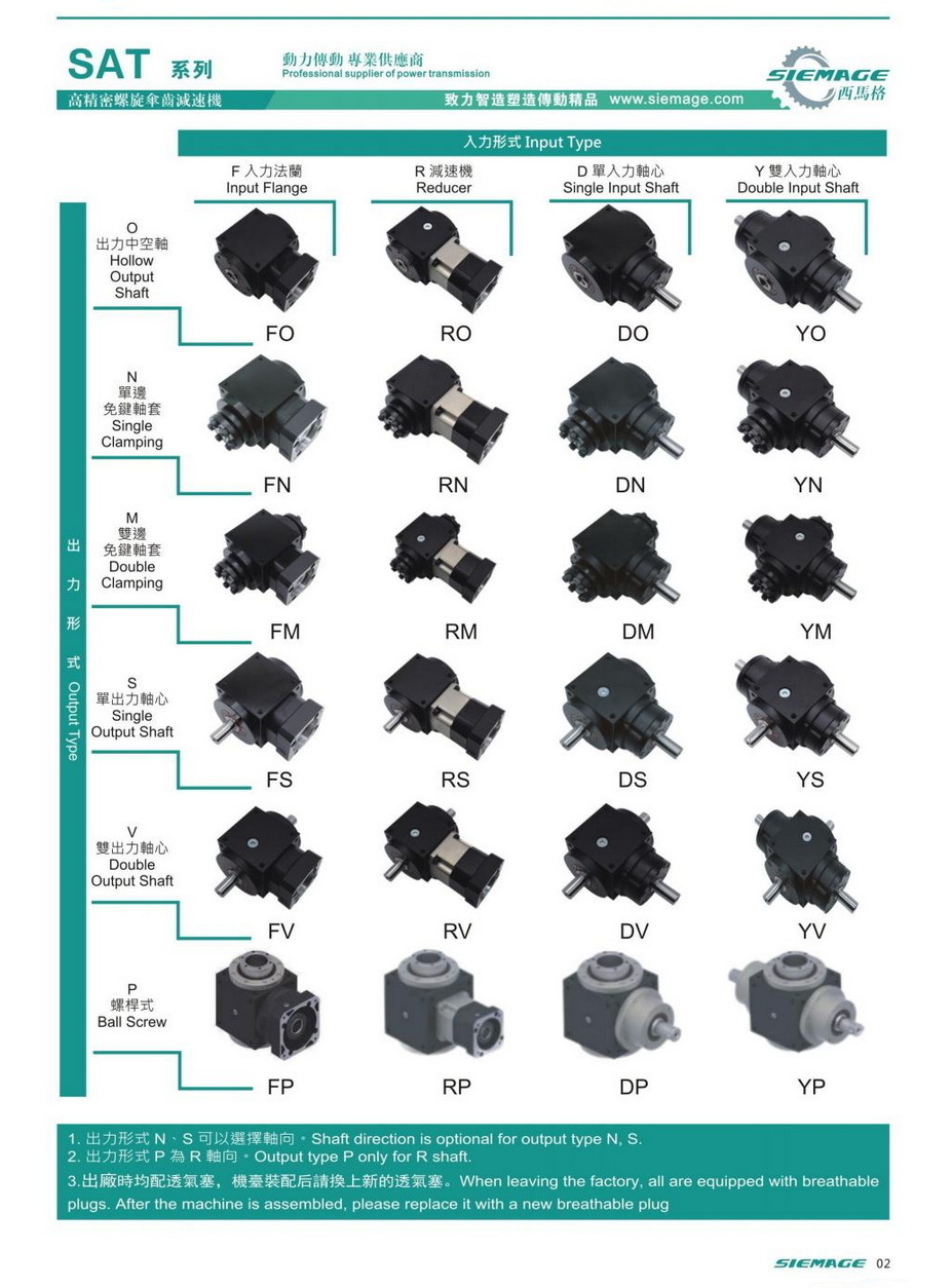 西马格螺旋伞齿轮减速形式有SAT-FO,SAT-FN,SAT-FM,SAT-FV,SAT-FP,SAT-RO,SAT-DO,SAT-YO,SAT-RN,SAT-RM,SAT-RS,SAT-RV,SAT-RP,SAT-DN,SAT-DM,SAT-DV,SAT-YS,SAT=YV等24种之种,满足各装安装需求。